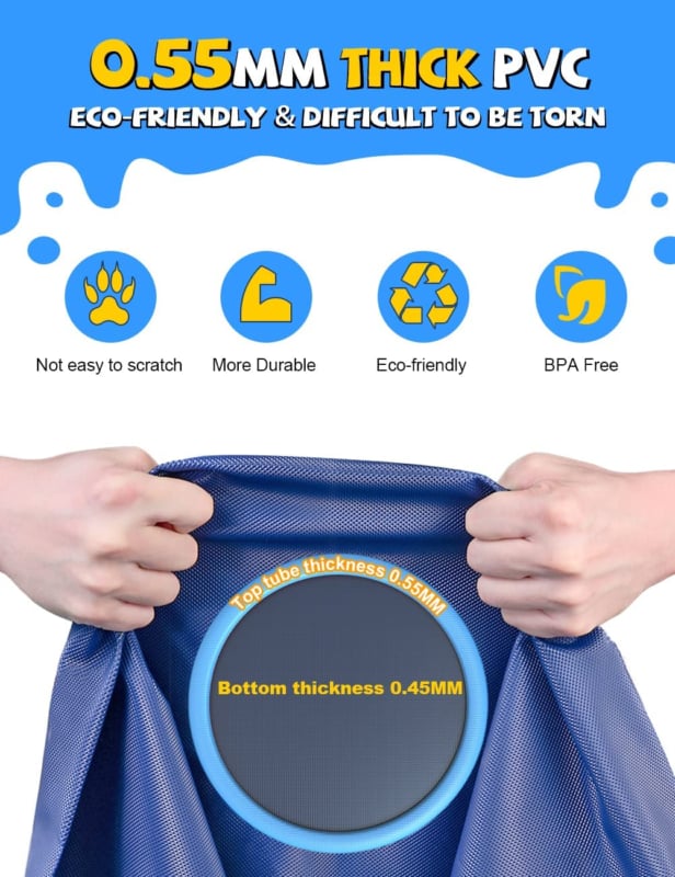 🌊Safe and Durable: Safety is our top priority. This Dog Splash Sprinkler Pad is made of environmental PVC material, non-slip and free from BPA and plasticizers, safe for daily use. 0.45mm thickness is 30% thicker than other splash pad, while high-quality edge sealing technology makes it difficult to burst.