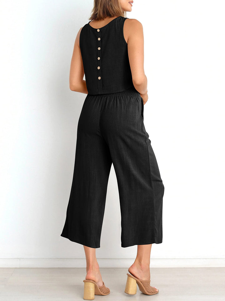 - Features - 2 piece outfits, sleeveless round neck crop top, wide leg cropped pants, button back, high waist, wide waistband.