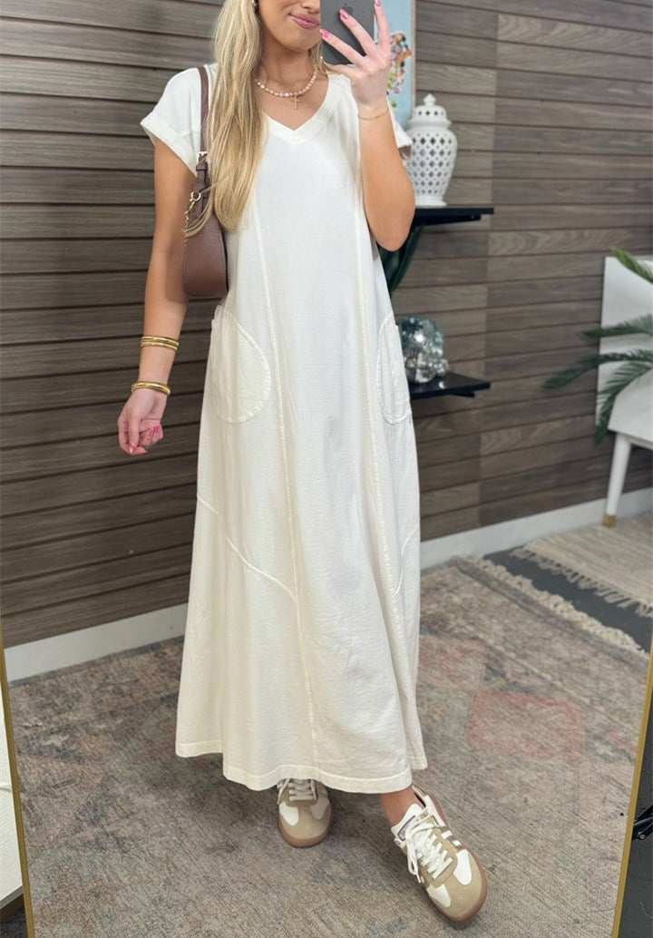 Turn heads in this short sleeve pocket maxi dress! With its versatile design, you can easily dress it up or down for any occasion. Whether you want to make a statement or keep it casual, this dress has you covered. Say hello to your new go-to outfit!
